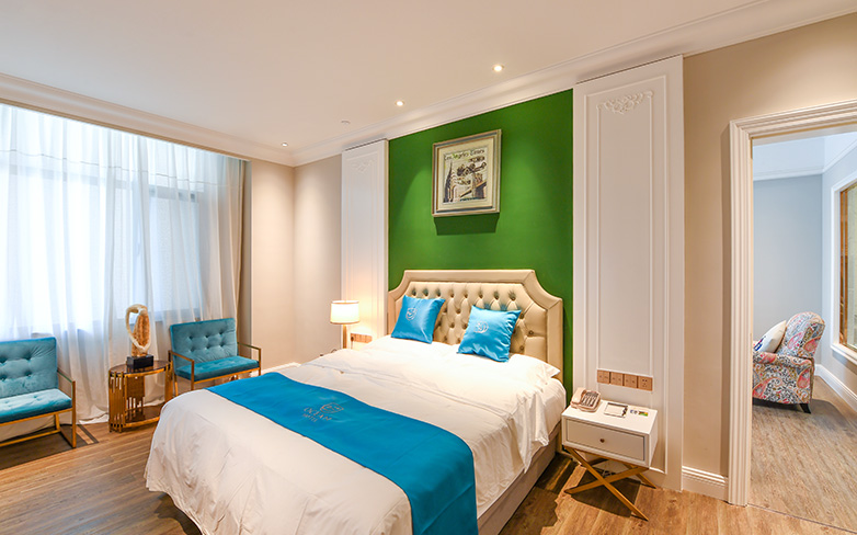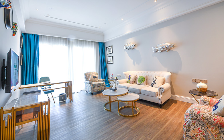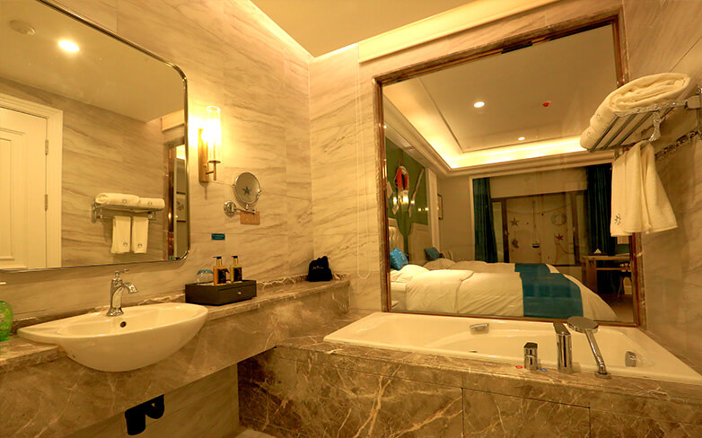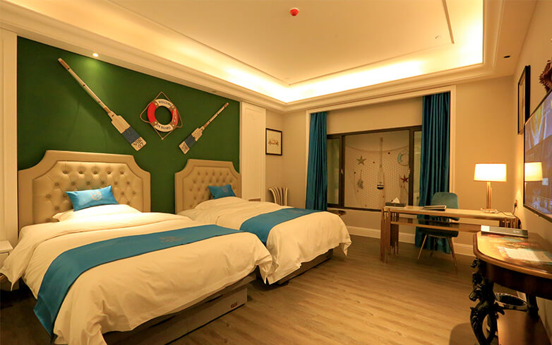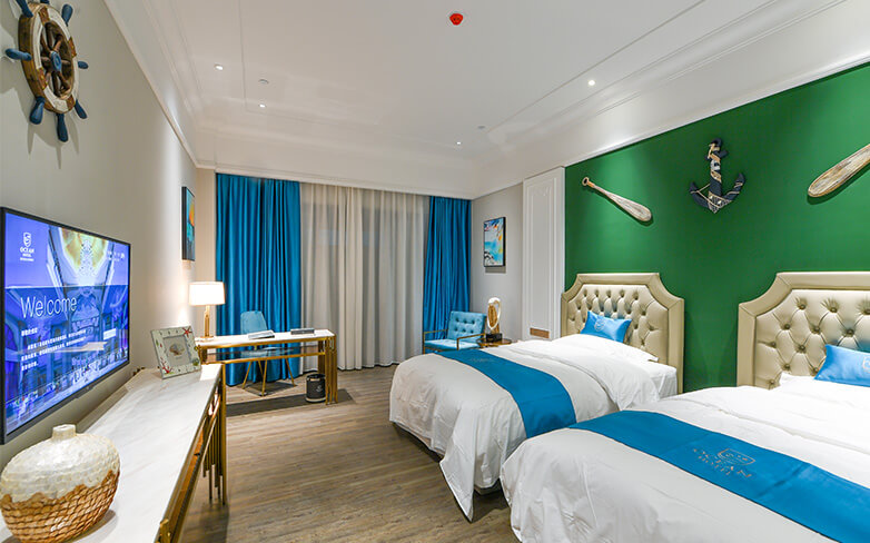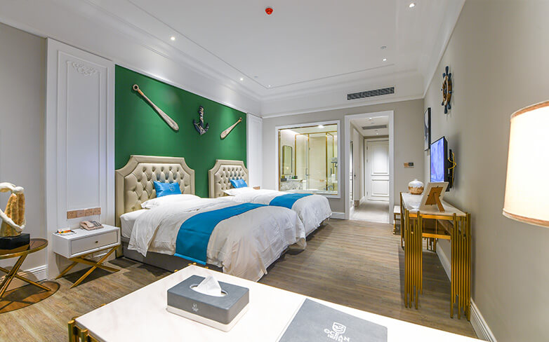 酒店以海洋文化为主题,在传承古典艺术的基础上注入现代美学的意蕴,以两者的碰撞与融合再现失落已久的梦想国度——亚特兰蒂斯的繁华与荣光。海洋酒店注重色彩的美感,运用蓝色、粉色、绿色等梦幻色彩表述其浪漫主义情怀。酒店穹顶、壁画、家具、灯饰等均呼应海洋文化主题,大堂“海洋之心”彩色琉璃雕塑象征着亚特兰蒂斯众神力量的源泉,运用火焰般激昂的红色、橙色以及幽静的蓝色、绿色搭配独具匠心的艺术造型,打造出震撼的视觉效果。