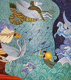 所有壁画由国内知名画师亲手创作,或以抽象派手法淋漓挥洒如同海洋般生生不息的想象力与创造力,或熠熠生辉地描绘出公元纪年的发展史,突出表现各星宿及星球的关系,细述亚特兰蒂斯的神秘传说,纵观之下不啻为一场震撼人心的绘画艺术展。