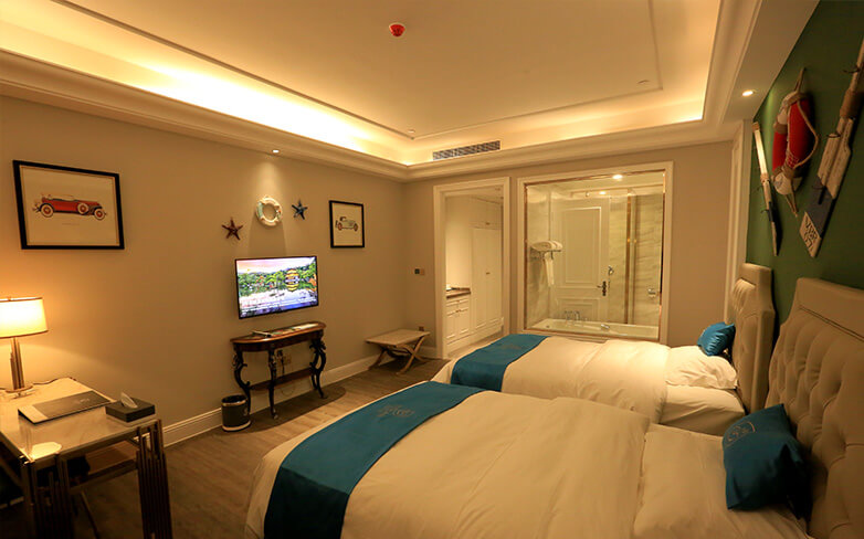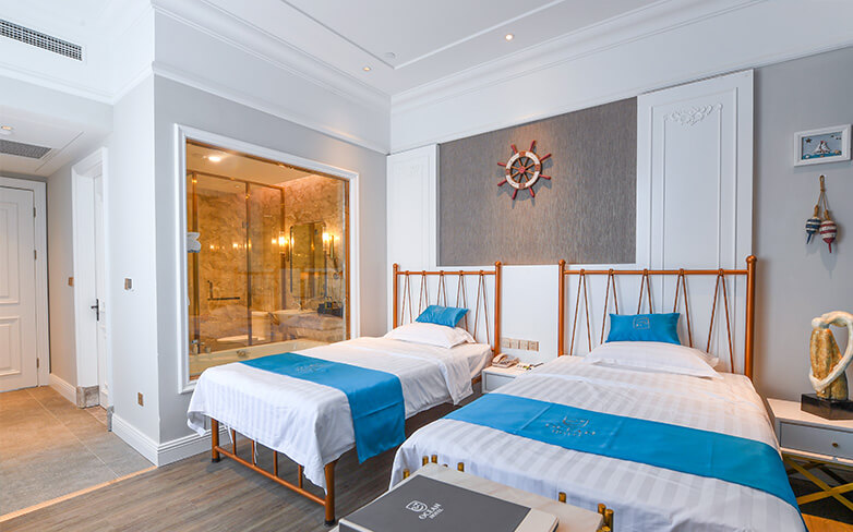 酒店客房以地中海风格为主,酒店配有爱琴海千人多功能厅、自助餐厅以及主题包厢。爱琴海多功能厅是胶东半岛唯一一座采用欧洲剧院式结构的多功能大厅,可同时容纳1000人,是举办企业年会、新品发布、商务论坛和私人宴会等高端大型活动的理想选择。