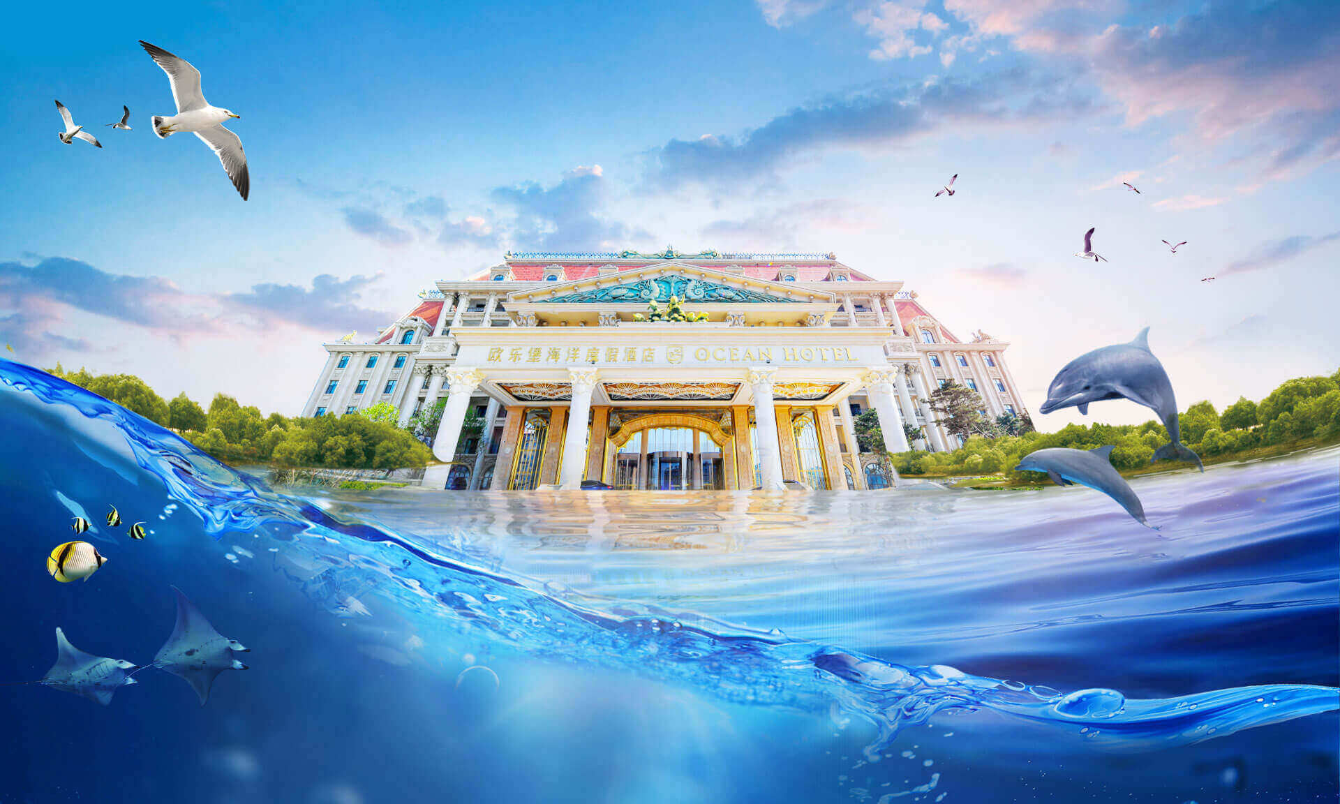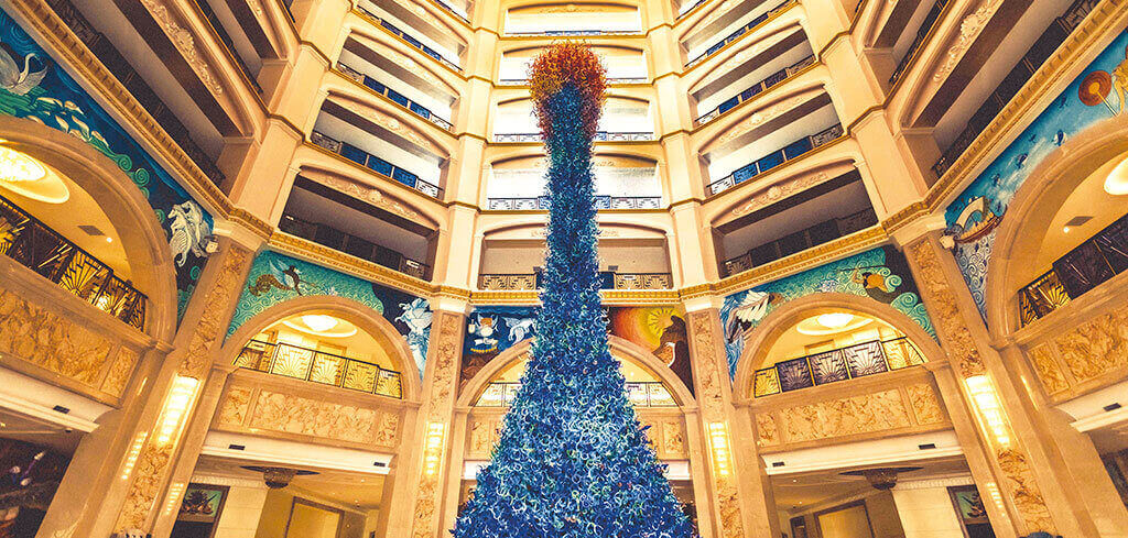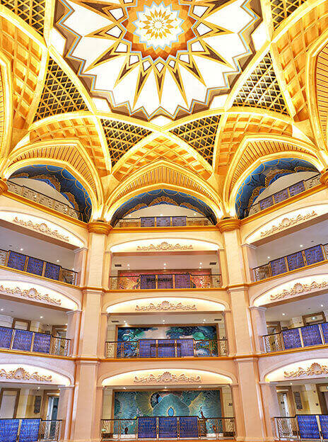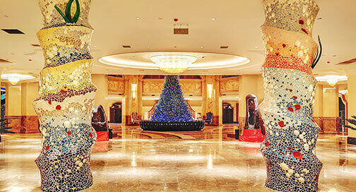 酒店以海洋文化为主题,在传承古典艺术的基础上注入现代美学的意蕴,以两者的碰撞与融合再现失落已久的梦想国度——亚特兰蒂斯的繁华与荣光。海洋酒店注重色彩的美感,运用蓝色、粉色、绿色等梦幻色彩表述其浪漫主义情怀。酒店穹顶、壁画、家具、灯饰等均呼应海洋文化主题,大堂“海洋之心”彩色琉璃雕塑象征着亚特兰蒂斯众神力量的源泉,运用火焰般激昂的红色、橙色以及幽静的蓝色、绿色搭配独具匠心的艺术造型,打造出震撼的视觉效果。