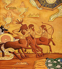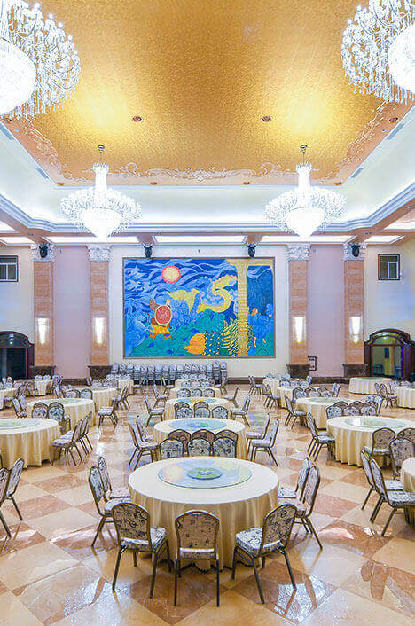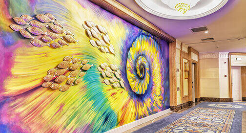 所有壁画由国内知名画师亲手创作,或以抽象派手法淋漓挥洒如同海洋般生生不息的想象力与创造力,或熠熠生辉地描绘出公元纪年的发展史,突出表现各星宿及星球的关系,细述亚特兰蒂斯的神秘传说,纵观之下不啻为一场震撼人心的绘画艺术展。
