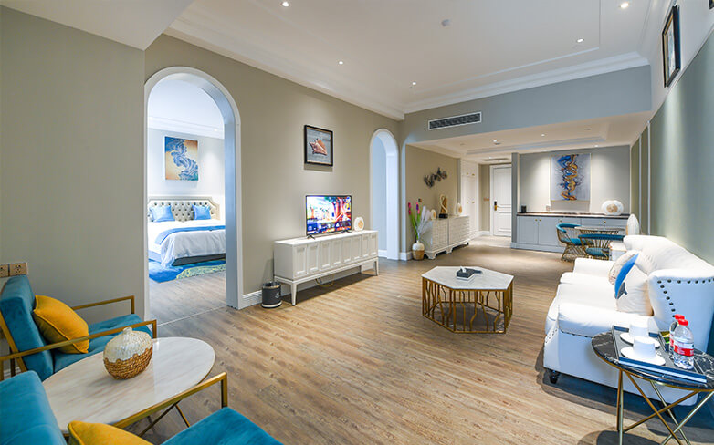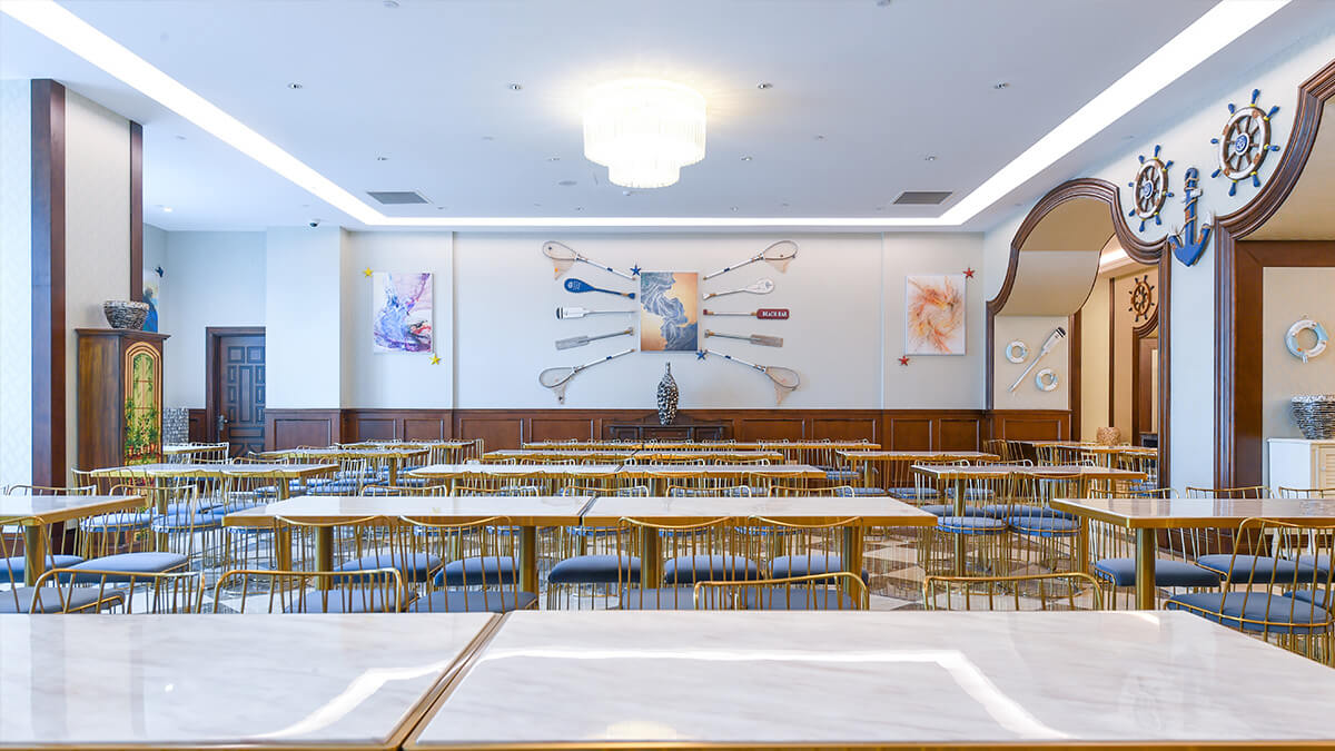 酒店以海洋文化为主题,在传承古典艺术的基础上注入现代美学的意蕴,以两者的碰撞与融合再现失落已久的梦想国度——亚特兰蒂斯的繁华与荣光。海洋酒店注重色彩的美感,运用蓝色、粉色、绿色等梦幻色彩表述其浪漫主义情怀。酒店穹顶、壁画、家具、灯饰等均呼应海洋文化主题,大堂“海洋之心”彩色琉璃雕塑象征着亚特兰蒂斯众神力量的源泉,运用火焰般激昂的红色、橙色以及幽静的蓝色、绿色搭配独具匠心的艺术造型,打造出震撼的视觉效果。