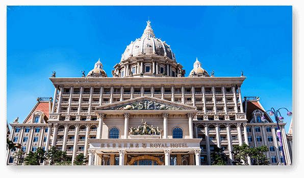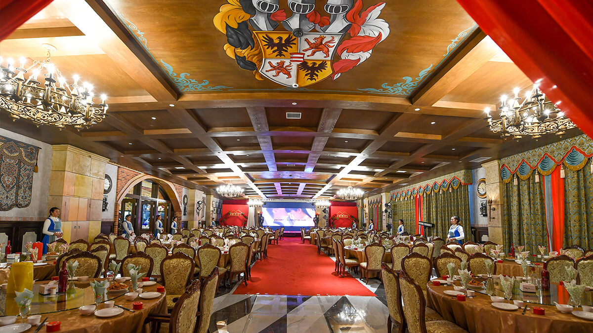 国际酒店以雍容奢华的欧式宫廷风格为主要特色。建筑外观气势恢弘,人物雕像形态各异、栩栩如生,造型威武的金色骑士雕塑凸显庄严雄伟,内部陈设及装潢则更富于艺术魅力,主色调采用明亮大方的灿金色,烘托富丽奢华、尊贵优雅的氛围,装饰则以巴洛克风格的雕刻、油画、彩窗及挂毯为主,配有工艺精湛的欧洲古典风格家具。高60多米的巨大金顶由24K纯金打造,气势非凡、光彩夺目,周边镶嵌的彩绘玻璃与柱式环廊充分展示着欧洲古典艺术的典雅之美,巨型水晶灯如瀑布般倾泻而下,内壁和圆顶上遍布的写实油画生动展现着欧洲贵族的生活和聚会场景,浪漫优雅的古典音乐轻柔舒缓。欧乐堡国际酒店以艺术匠心精心雕琢每一处细节,以贵族风范彰显宾客的尊荣威仪,充分体现出西方古典文化高贵的单纯和静穆的伟大。