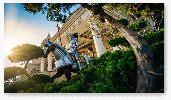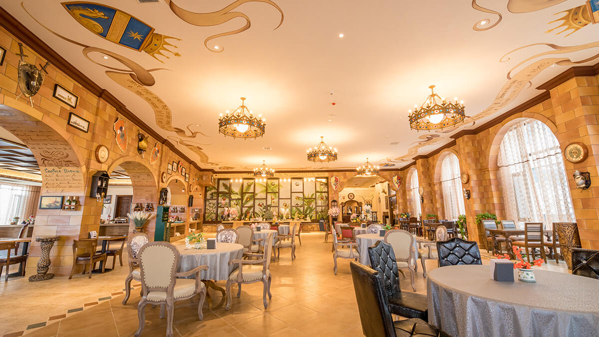 骑士度假酒店展现了欧洲古典艺术酒店恢弘华美、高贵典雅的格调,装饰设计上则更多的注入中世纪骑士文化的精髓。酒店遍布大量的骑士雕塑、绘画、纹章、盔甲、旗帜,以更多的巨幅画作描绘骑士授勋、欧洲贵族聚会和生活等具有代表性的场景,生动讲述影响和推动欧洲历史进程的著名事件,为宾客打造沉浸式的文化体验。大堂矗立的骑士军团雕塑气势如虹,让人油然而生对于坚毅、勇敢、忠诚、正直的骑士精神的向往。酒店陈列的纹章、旗帜图样来自于欧洲中古时代不同的家族,约有近百种之多,无一重复,再现了骑士时代的荣耀与辉煌,致敬永远的神话——高贵的骑士精神。