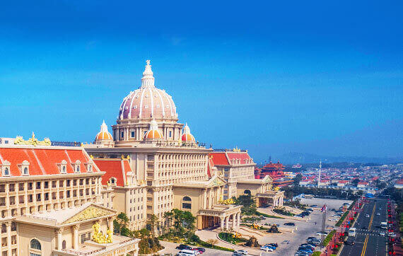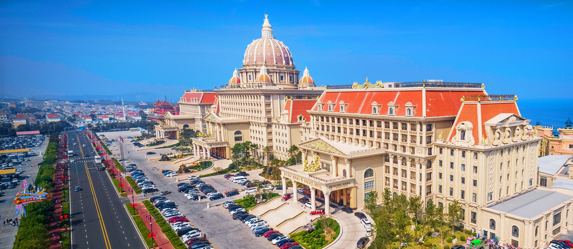 国际酒店由蓬莱八仙过海旅游集团投资打造,以国际化的理念、世界级的艺术水准为基准,匠心倾注、取精用弘、博采众长,汲取欧洲古典主义建筑美学的精髓,高贵奢华的穹顶、典雅瑰丽的珐琅彩玻璃、风格浓郁的巨幅油画等震撼人心的艺术珍品成就了一座文化、雕塑、壁画、建筑艺术集大成的文化艺术殿堂。酒店由骑士度假酒店、国际酒店、海洋度假酒店三座不同主题的单体酒店组成,中央国际酒店气势雄伟,两翼骑士酒店与海洋酒店各具特色,三座酒店外观浑然一体,内部由西斯廷天顶画长廊贯通,以艺术化的视觉彰显出欧洲古典文化多元、浪漫、典雅的人文情怀和艺术气质。