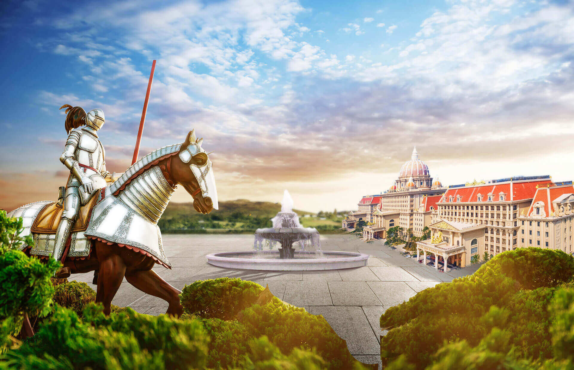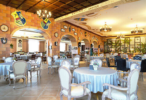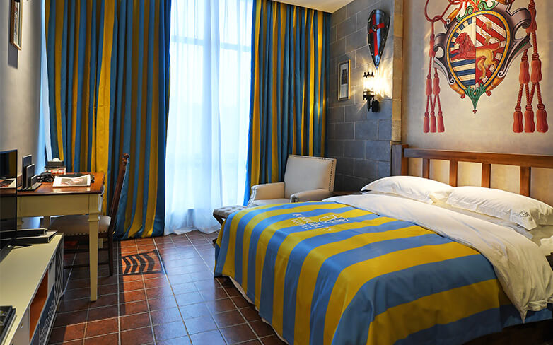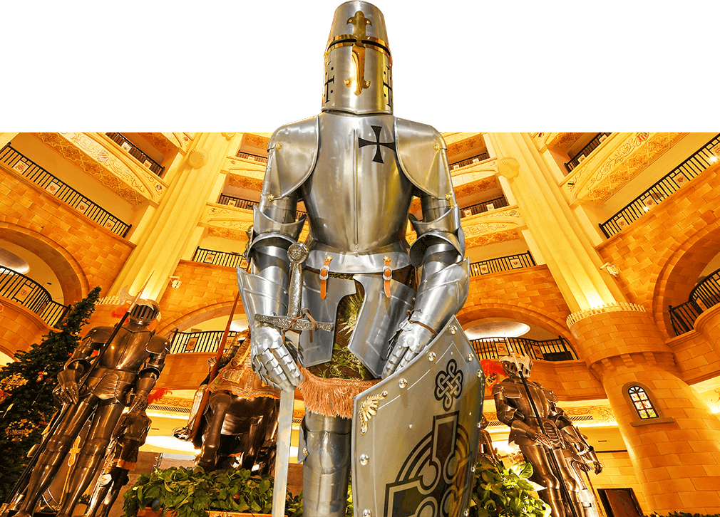 骑士度假酒店展现了欧洲古典艺术酒店恢弘华美、高贵典雅的格调,装饰设计上则更多的注入中世纪骑士文化的精髓。酒店遍布大量的骑士雕塑、绘画、纹章、盔甲、旗帜,以更多的巨幅画作描绘骑士授勋、欧洲贵族聚会和生活等具有代表性的场景,生动讲述影响和推动欧洲历史进程的著名事件,为宾客打造沉浸式的文化体验。大堂矗立的骑士军团雕塑气势如虹,让人油然而生对于坚毅、勇敢、忠诚、正直的骑士精神的向往。酒店陈列的纹章、旗帜图样来自于欧洲中古时代不同的家族,约有近百种之多,无一重复,再现了骑士时代的荣耀与辉煌,致敬永远的神话——高贵的骑士精神。