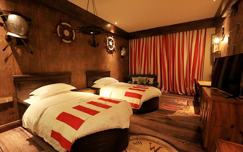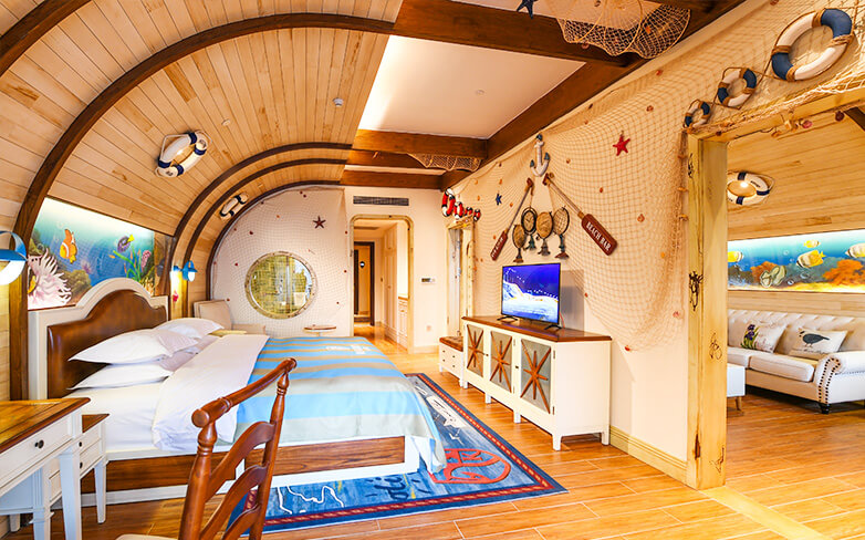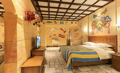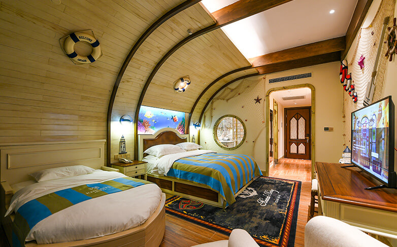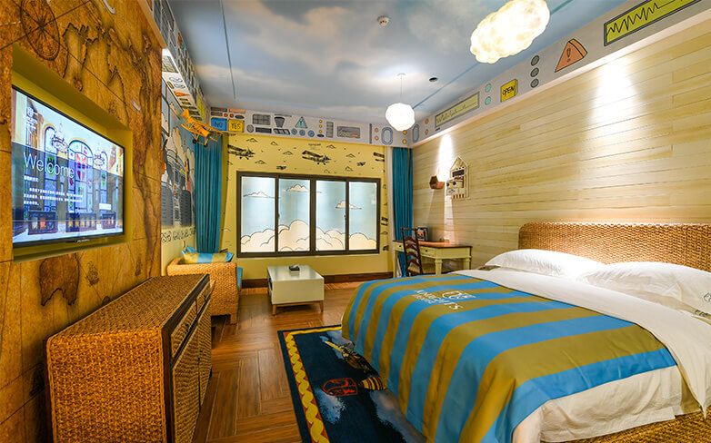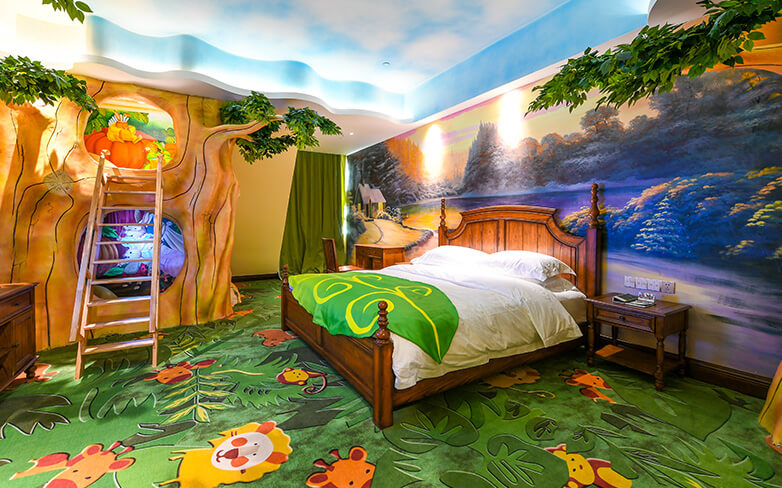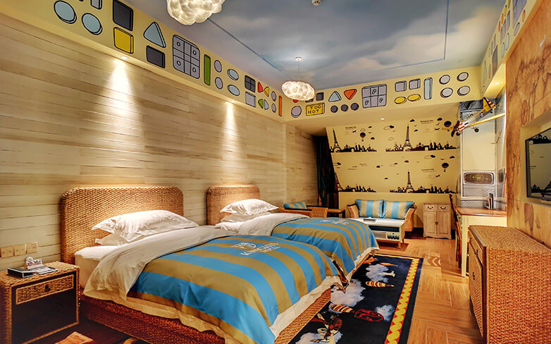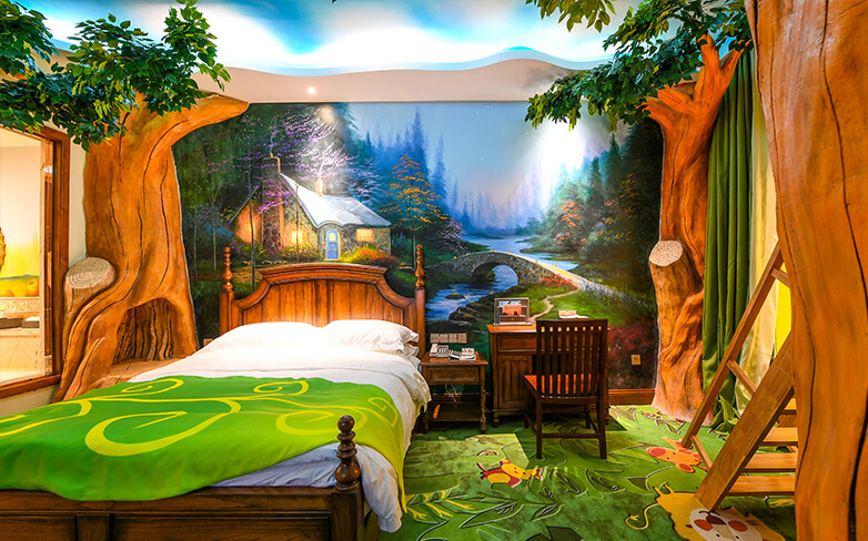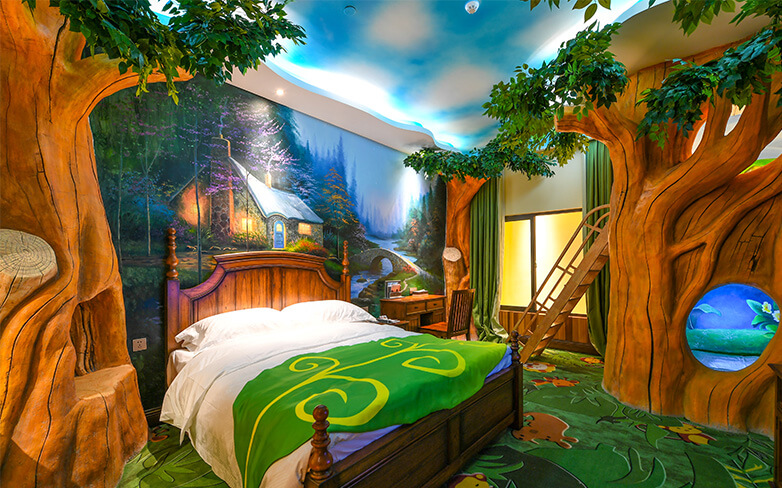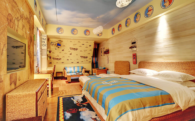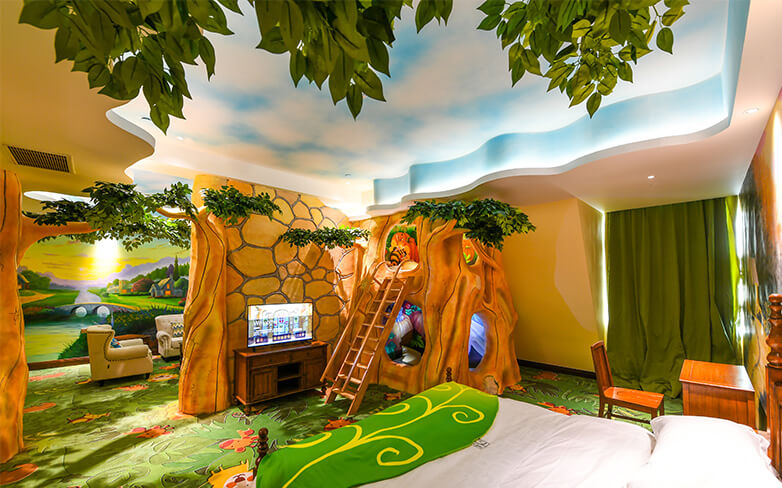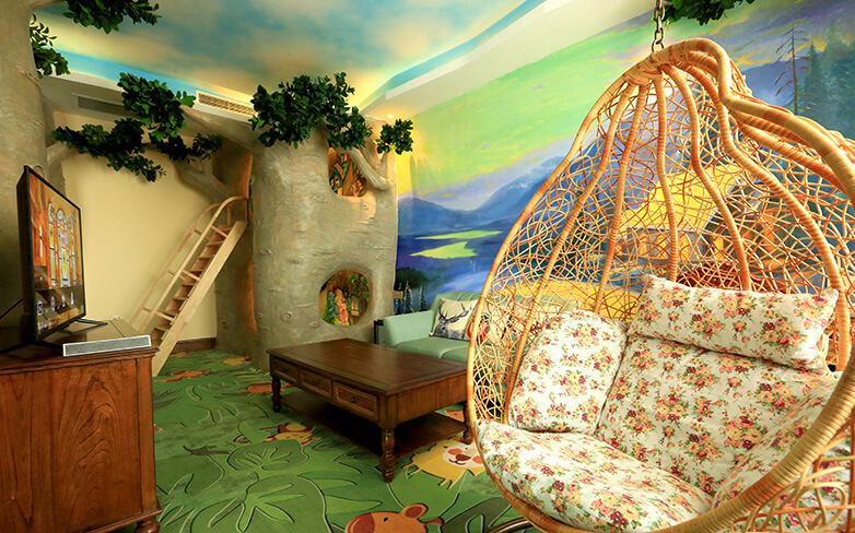酒店客房充满童话气质,打造置身梦境般的入住体验,拥有森林树屋、骑士屋、水手屋、飞行屋四大主题房,房间设计新颖童趣,装饰氛围极具童真与野趣,充满了脑洞大开的奇思妙想。非凡的创意设计将房间打造成童话仙境,使梦境中的美好落入现实,适合所有心中有梦的大儿童和小朋友,留驻小朋友的童真与完美记忆,唤醒成年人心底的天真烂漫,是家庭出行、亲子度假的最佳选择。