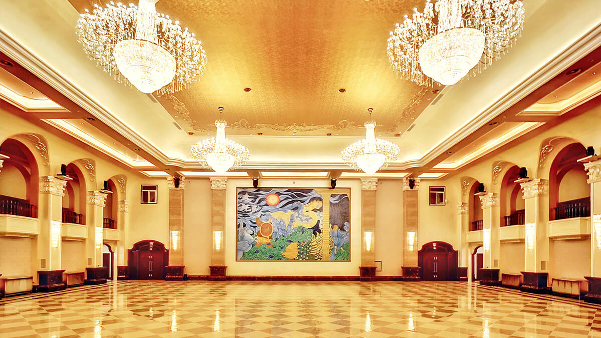 两座无柱型千人多功能厅,体量宏大、设施齐全、功能完备,是举办国内外商企盛会、论坛峰会、高端私宴、轻奢酒会的绝佳场所。宴会厅地面铺设暖色调方格地砖,墙面装饰以浓墨重彩的欧式壁画,上方枝型水晶吊灯流光溢彩,顶面四周金色边框熠熠生辉,营造明亮通透的视觉感受的同时,突出高贵典雅的艺术品味。威尼斯厅拥有国内罕见的集合百人盛景的巨幅壁画,画中百人身姿各异,面部神态栩栩如生,具有极高的艺术水准和鉴赏价值。